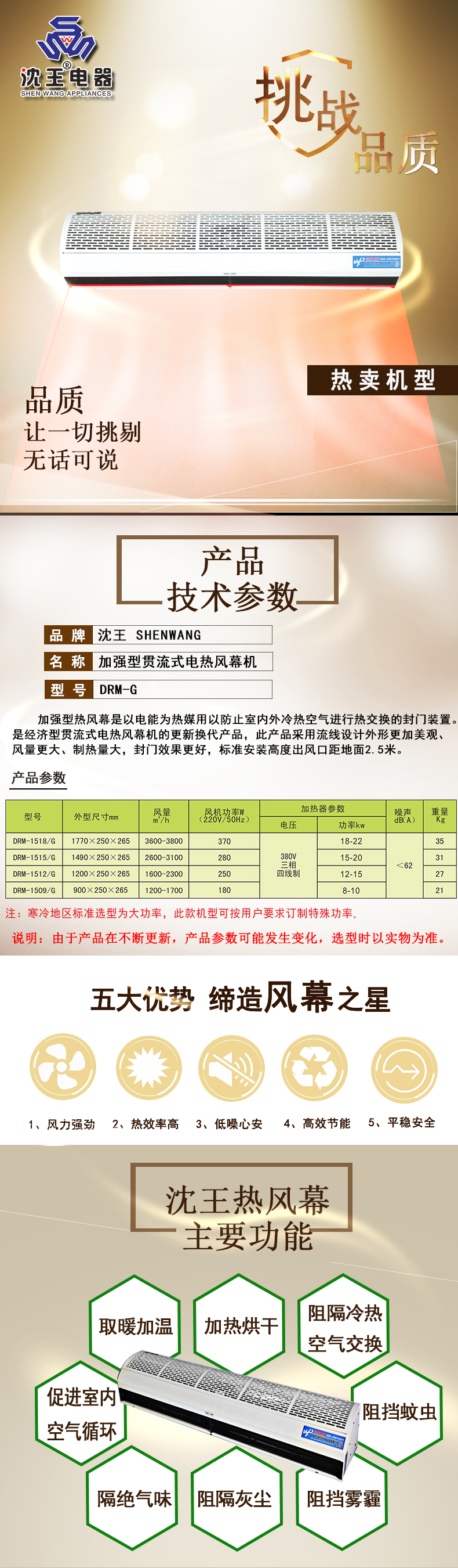 簡介:加强型热风幕是以电能为热媒用以防止室内外冷热空气进行热交换的封门装置。此产品采用流线设计外型更加美观,风量更大、制热量大,封门效果更好,标准安装高度出风口距地面2.5米。