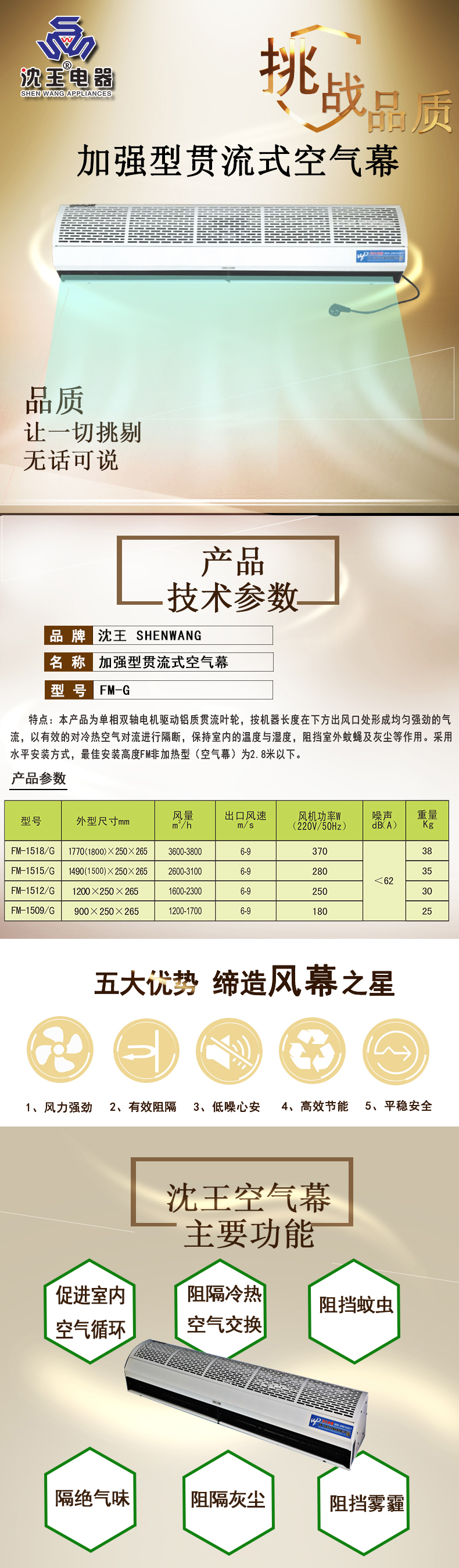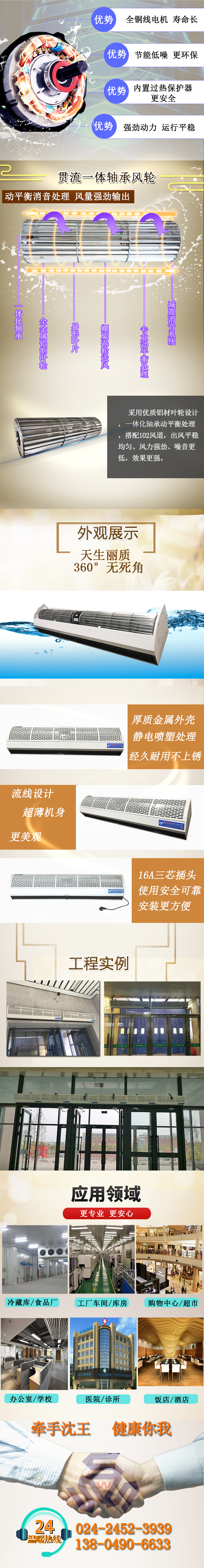 簡介:本产品为单相双轴电机驱动铝质贯流叶轮,按机器长度在下方出风口处形成均匀强劲的气 流,以有效的对冷热空气对流进行隔断,保持室内的温度与湿度,阻挡室外蚊蝇及灰尘等作用。