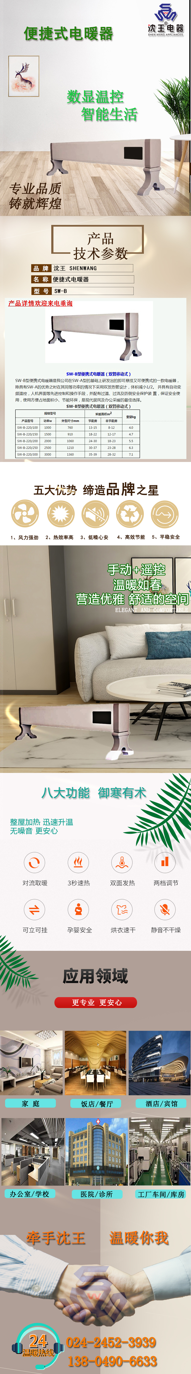 簡介:SW-B型便携式电暖器是我公司在SW-A型的基础上研发出的即可悬挂又可便携式的一款电暖器,除具有SW-A的优势之时在其同等功率的情况下采用双发热管设计。